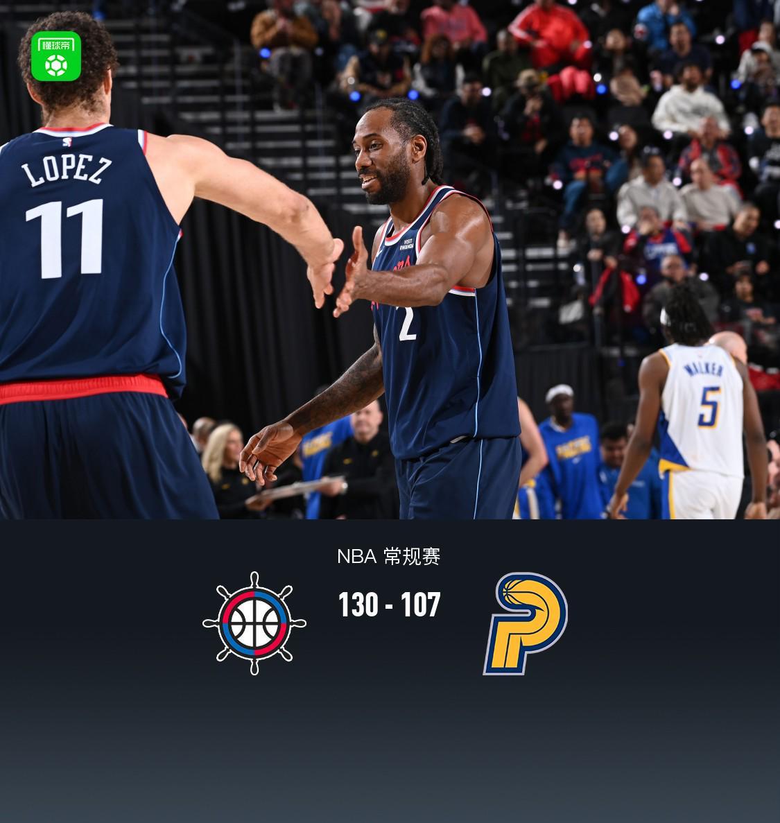 第四节快船达里厄斯-加兰拿下6分,步行者贾雷斯-沃克拿下13分,最终快船130-107战胜步行者
