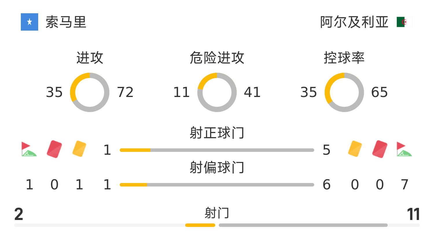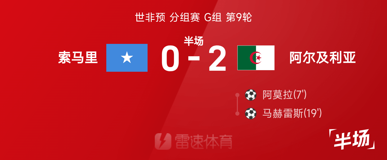 10月10日讯 26赛季世非预分组赛G组第9轮,索马里迎战阿尔及利亚。半场战罢,双方比分暂为索马里0-2阿尔及利亚,阿莫拉、马赫雷斯破门建功。